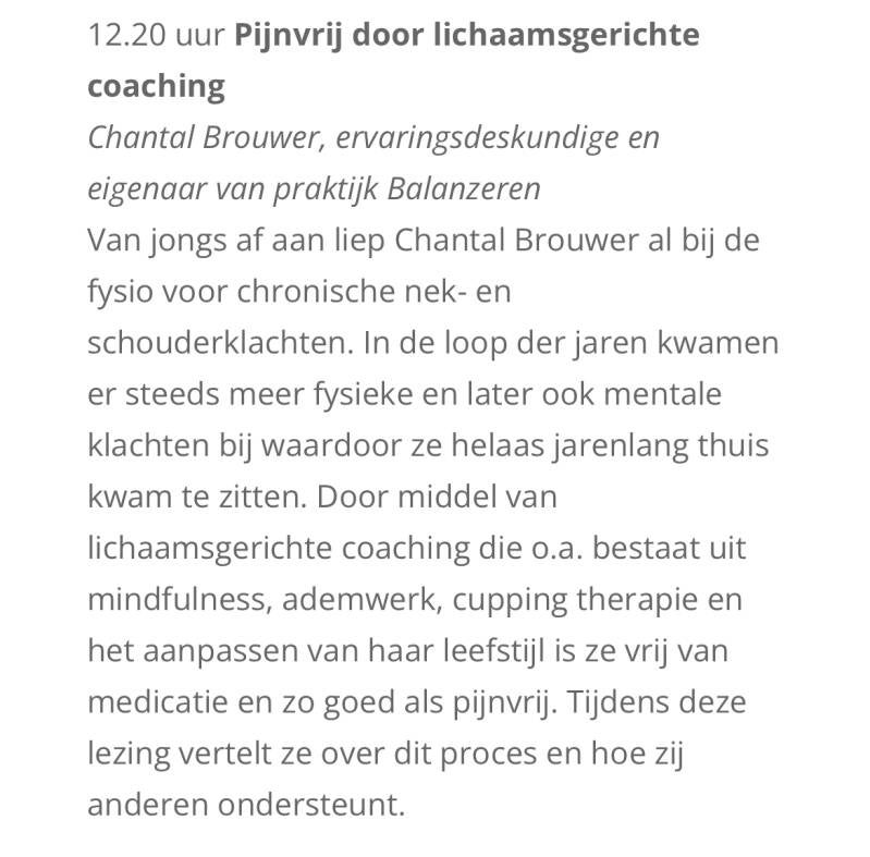 Dus volgende week, vrijdag 17 november, ga ik een lezing geven op het Congres ‘Pijn en pijnbestrijding’ voor Congressen met zorg. Ik ben al lekker bezig met uitwerken van mijn lezing ‘Pijnvrij door lichaamsgerichte coaching’ en ik krijg er echt zin in.