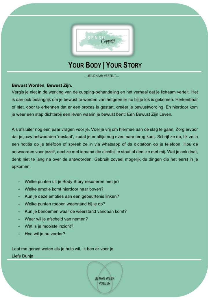 Van Dunja ontvang je na afloop een Body Story met een verslag van de behandeling en vragen die je (voor jezelf) mag beantwoorden. N.a.v. haar vragen maak ik altijd een vrij uitgebreid verslag waarin ik ook alle gevoelens benoem die bij mij naar boven komen. Dit helpt voor mij mee in het helingsproces. De behandeling ervaar ik dan voor een tweede keer en komt dan ook weer zo binnen bij mij. Mijn verslag deel ik altijd graag met Dunja. Zo kunnen wij samen het e.e.a. benoemen en plaatsen en kom ik weer dichter bij mijn authentieke zelf.